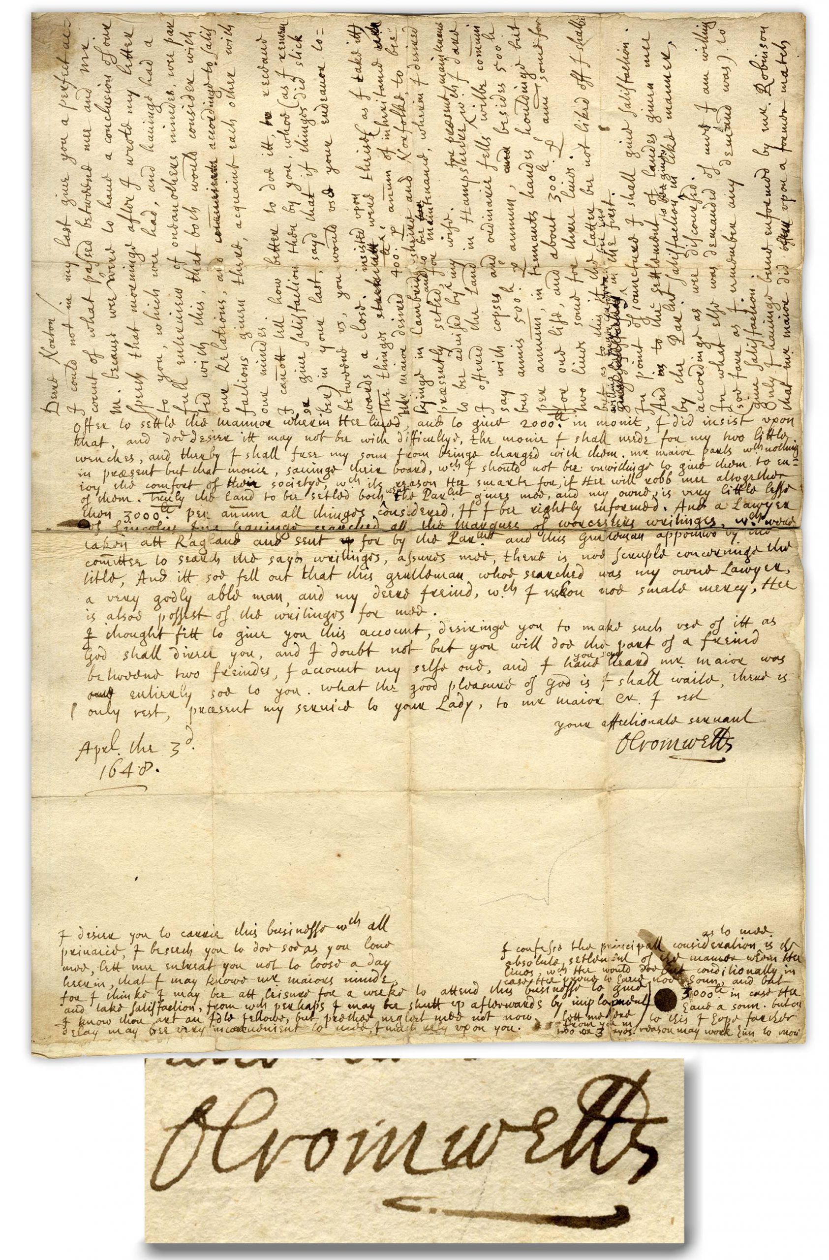 Oliver Cromwell autograph letter signed with intriguing content regarding the proposed marriage of his oldest son Richard to Richard’s eventual wife Dorothy, the daughter of Richard Maijor. Letter is important not only for its date — 3 April 1648, as the Second English Civil War was brewing, but also for the pairing of the young couple. Quoting from Cromwell’s biographer Samuel Church in “Oliver Cromwell, a History”, the choice of companion for his son revealed Cromwell’s character: “Had Oliver at this time cherished the bold schemes for dominion which his enemies impute to him, he would never have sought this obscure alliance with the daughter of a country gentleman.” Indeed this “country gentleman” had only served as High Sheriff of Hampshire before the marriage of his daughter, but would subsequently serve as Member of Parliament, as well as in Cromwell’s English Council of State. Sold for your $8,100.