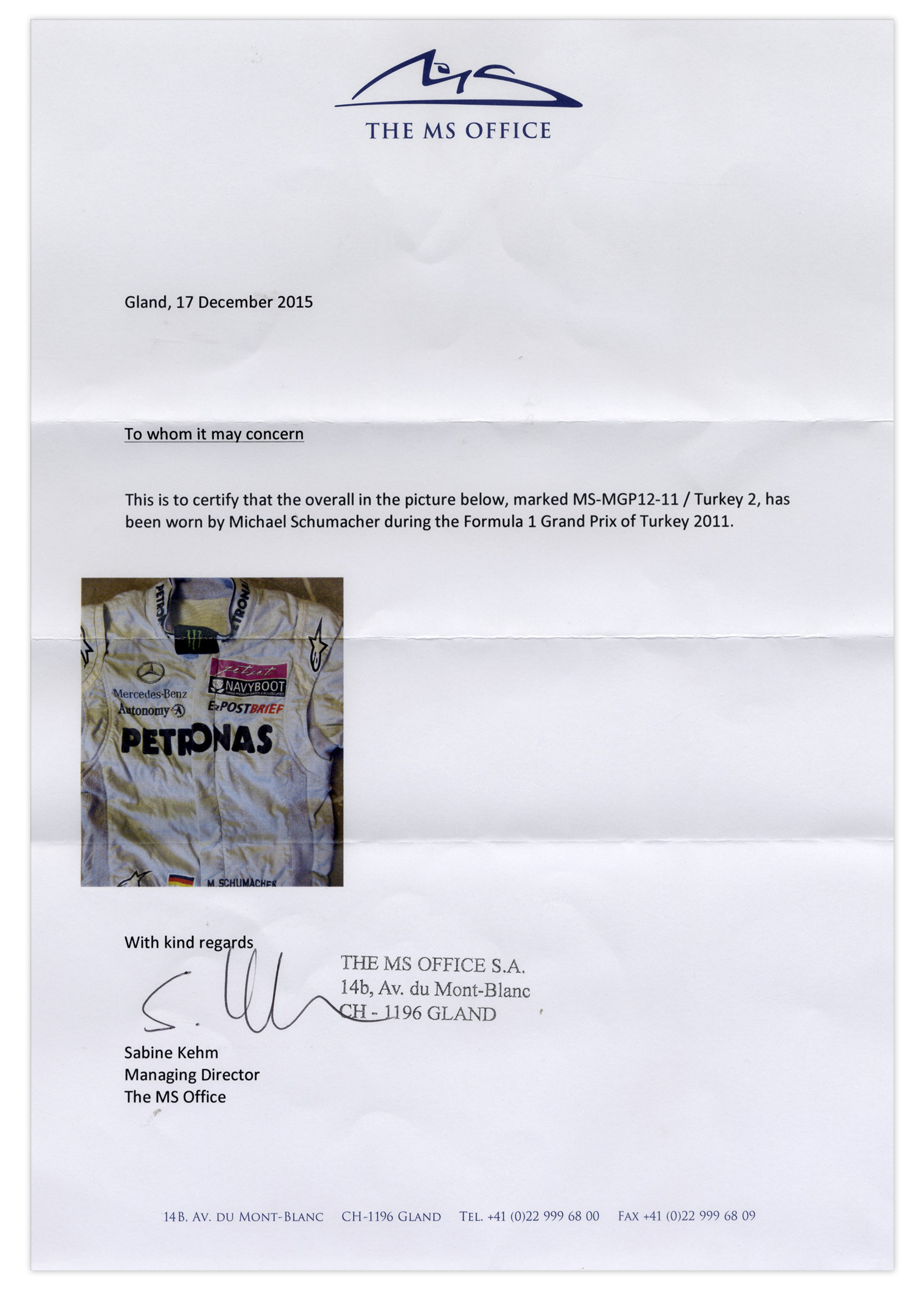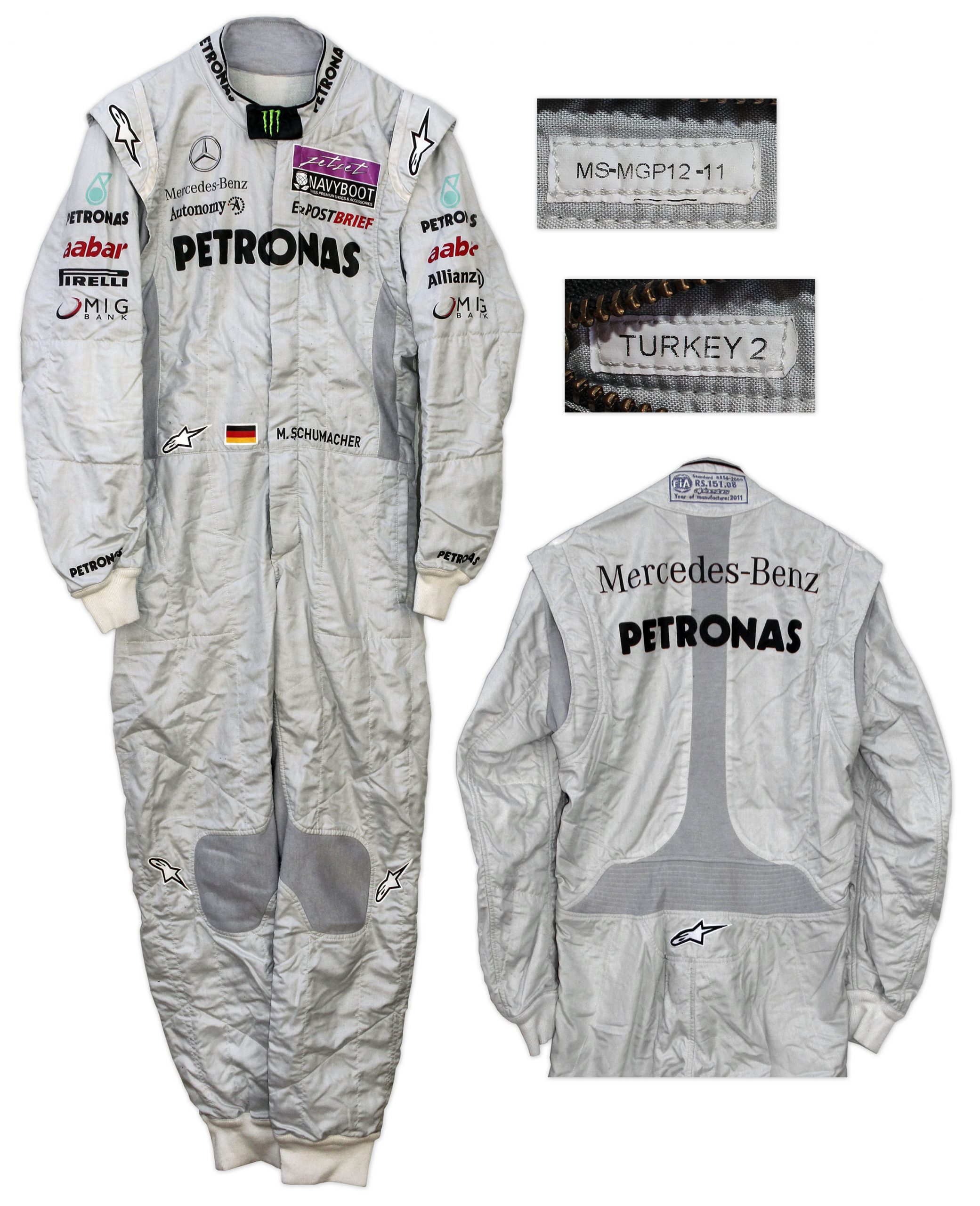 Seven-time Formula One champion, Michael Schumacher worn F1 racing suit from the 2011 Turkish Grand Prix. White suit is marked “MS-MGP12-11″, with Schumacher’s name at the waist. Made by Alpinestar of 100% Nomex material. Zips up the front with a concealed zipper. Measures approximately 19″ across the chest with a 23” inseam. Near fine condition. With an LOA from The Michael Schumacher Office, signed by Sabine Kehm, its Managing Director. Sold for $6,616.