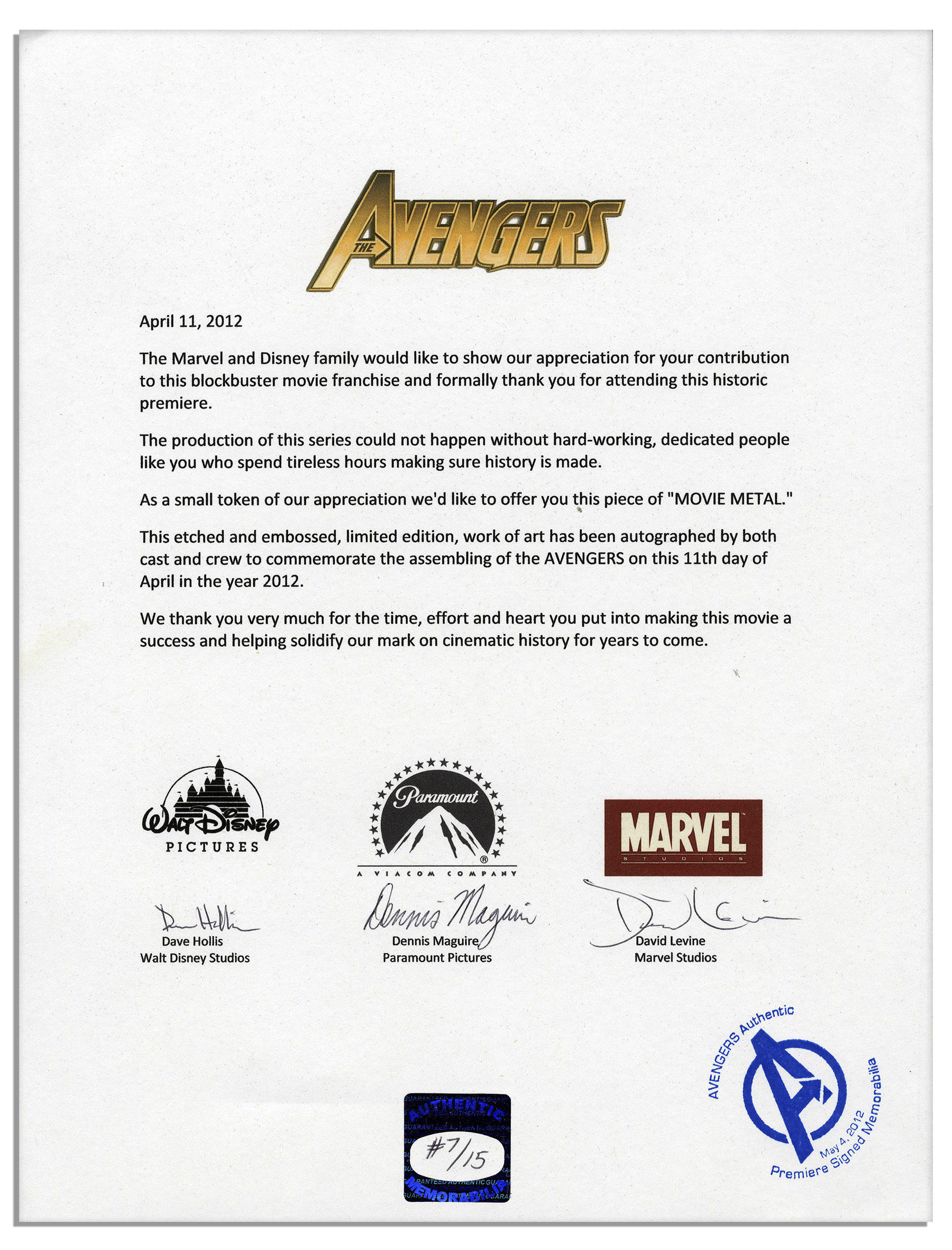 Avengers poster signed by 14 members of the cast. Signatures comprise Robert Downey Jr., Chris Evans, Mark Ruffalo, Chris Hemsworth, Scarlett Johansson, Jeremy Renner, Tom Hiddleston, Clark Gregg, Cobie Smulders, Samuel L. Jackson, Gwyneth Paltrow, Joss Whedon, Stan Lee and Jon Favreau. Poster is made of painted metal and features the Marvel name to the upper right and date ”5.4.12”. Measures 14” x 12”. Near fine. With a COA from Marvel, Disney and Paramount. Sold for $1,563.
