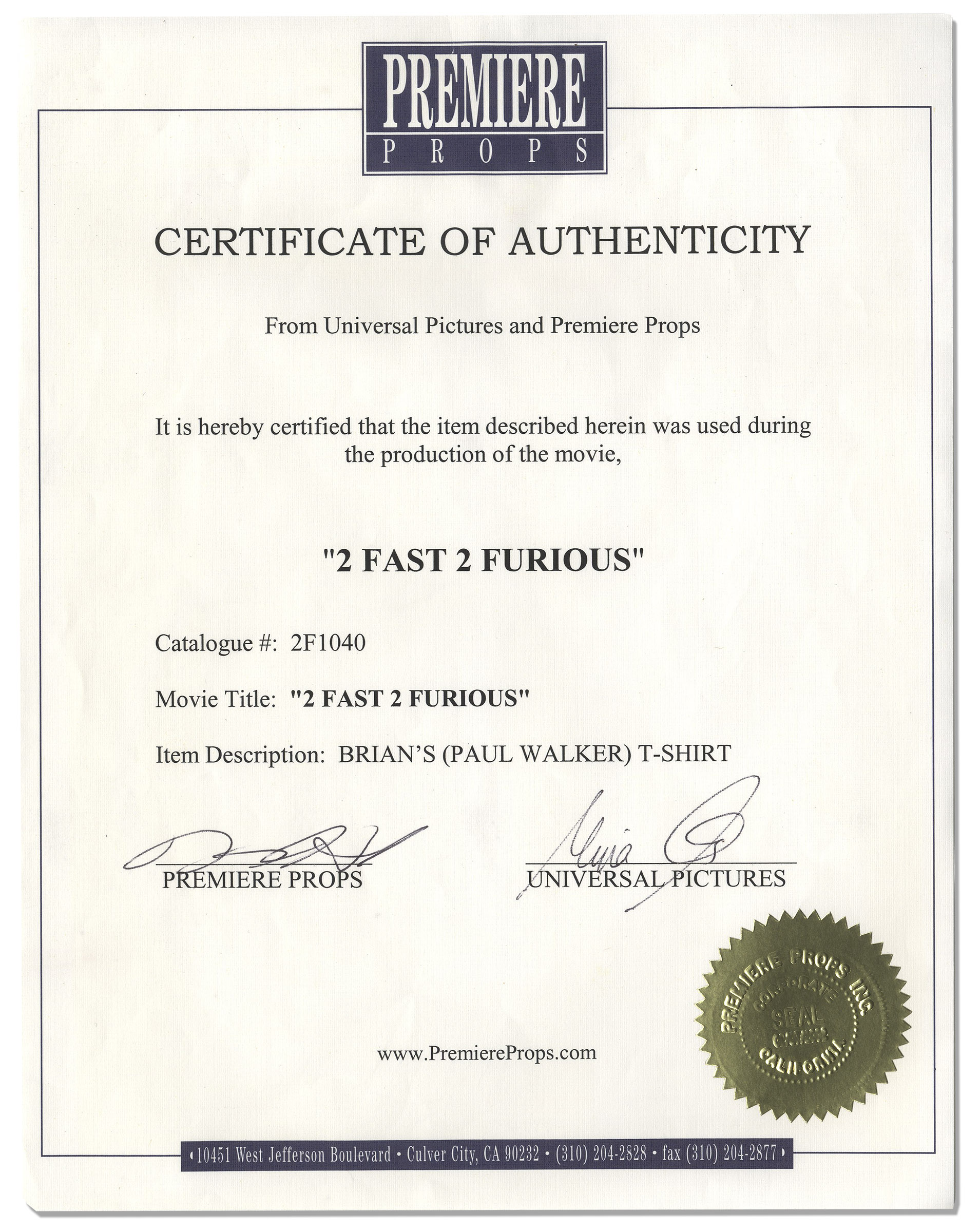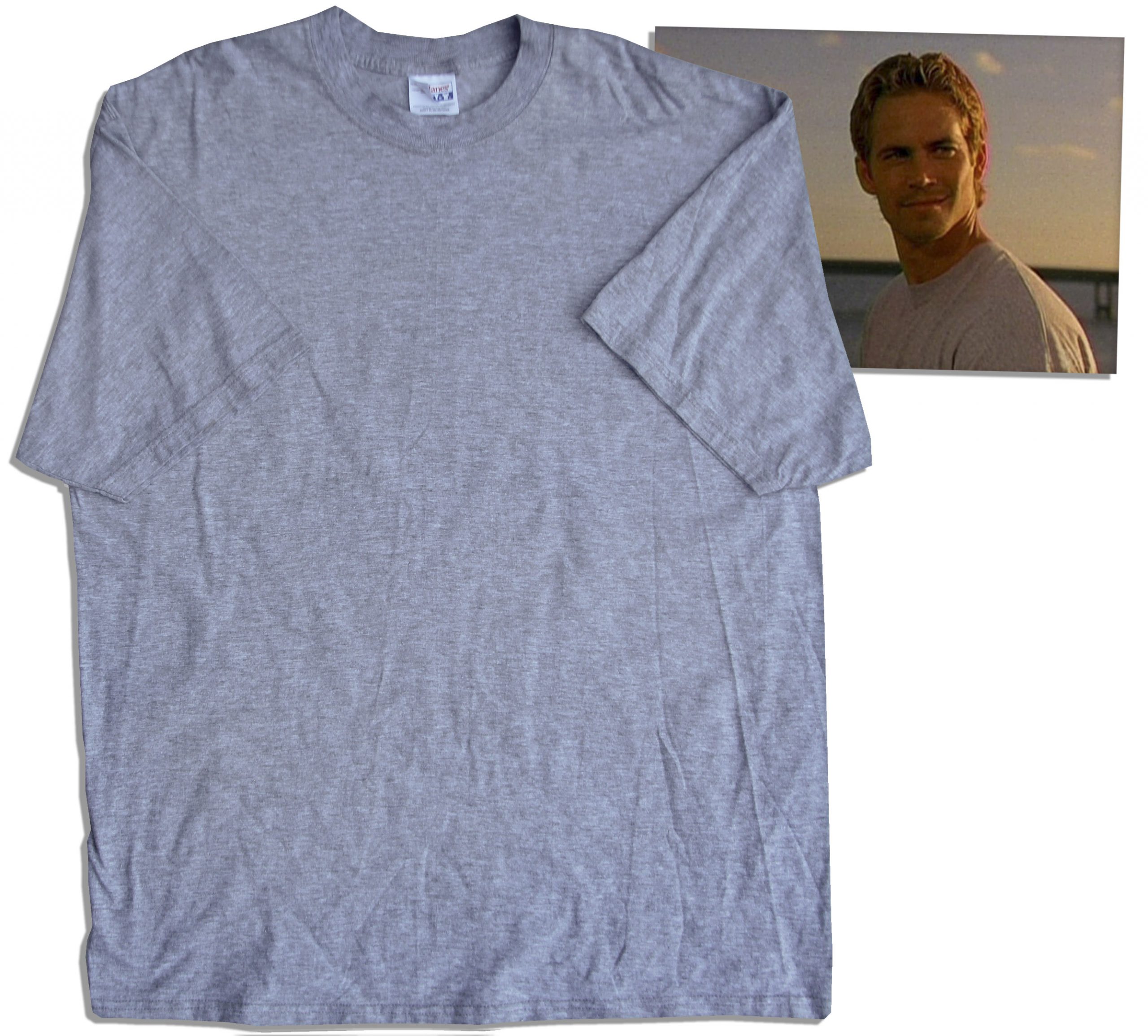 Paul Walker’s t-shirt from “2 Fast 2 Furious”, his most celebrated film, set in the underground world of street racing. Heather grey t-shirt by Hanes is a size XL. Near fine. With a COA from Premiere Props. Sold for $1,566.