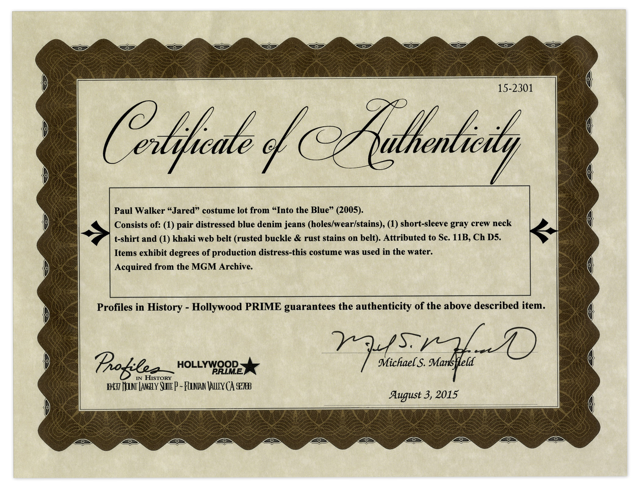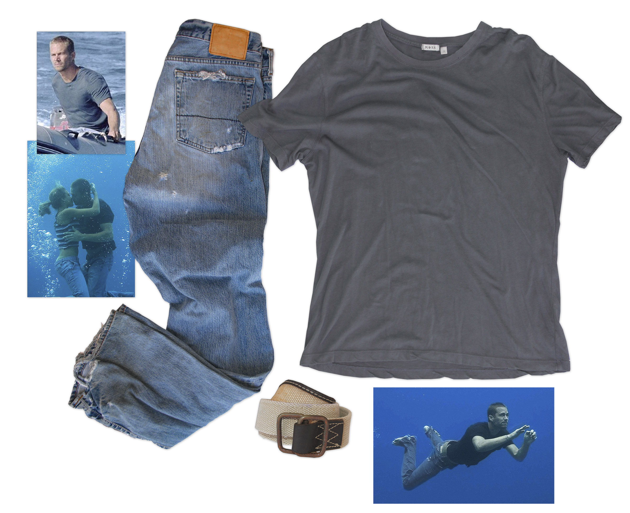 Paul Walker screen-worn outfit as “Jared” in “Into the Blue”, co-starring Jessica Alba. Three piece outfit was worn in the water, and includes jeans, shirt and belt: (1) Abercrombie and Fitch 1892 distressed blue jeans, size 34 x 34; (2) More brand short-sleeve grey t-shirt, size 3; (3) Khaki cloth belt measuring 43″ long. Acquired from MGM Archive and with a COA from Profiles in History. Jeans have intentional fraying and small holes, and a rip in each cuff; shirt has intentional fraying on sleeve-ends and belt has discoloration, rusted buckles and minor intentional fraying. Very good condition. Sold for $1,226.