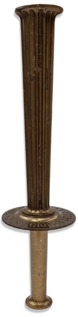 Olympic relay torch used in the 1960 Summer Olympics. The Torch Relay tradition began in 1928, and transports a spark from the parent flame in Olympia, Greece to the host city in time for the opening ceremonies, in this case Rome. Designed by Pier Luigi Nervi and Amedeo Maiuri, the torch is based on a classical model and is meant to resemble torches depicted on ancient monuments. Made of aluminum and then bronze plated, the torch bears the Olympic rings and is labeled ”GIOCHI DELLA XVII OLIMPIADE” on ring. On underside of base it gives the manufacturer’s information, ”M.F. – CURTISA – BOLOGNA” with the torch number ”419”. Torch measures 15.75” and weighs 1 lb. 3.6 oz., or 555 g (without flame). Some fading of bronze plating and minor nicks from use, overall very good condition. Sold for $3,328.