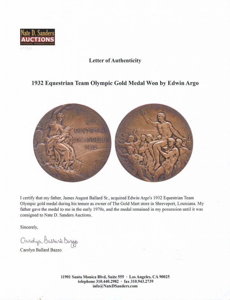 Extraordinary rare Olympic gold medal awarded in the 1932 Summer Games, won by American Edwin Argo in the Equestrian Team Event. Riding his horse Honolulu Tomboy, Argo was the only rider with no faults in the jumping portion of the three-day event that won gold for the United States. He was also the only field artillery officer in the competition, having attended West Point before dropping out to fight in World War I.