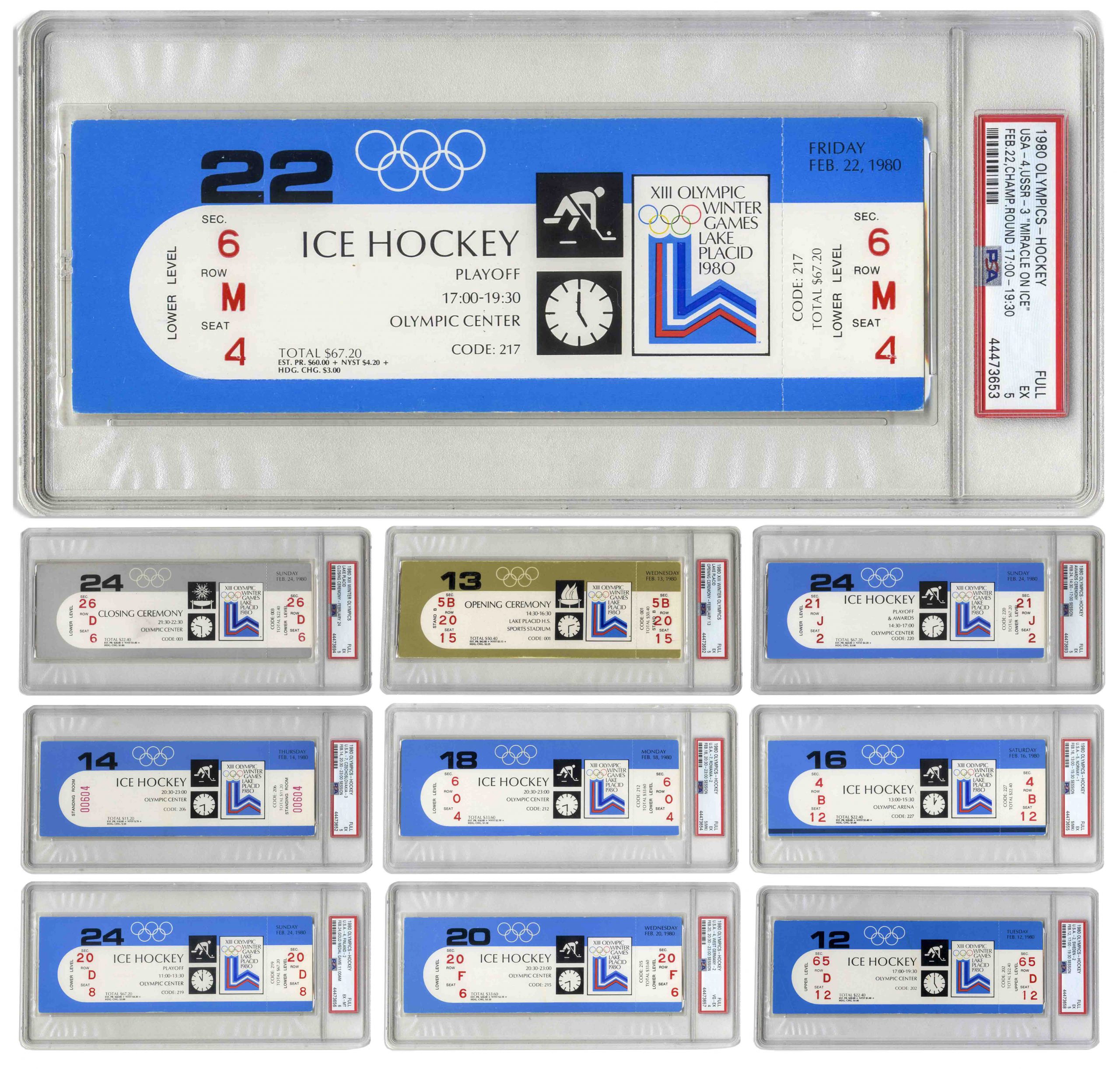 Lot of 10 Hockey Tickets for the 1980 Olympics, Including the US vs. USSR “Miracle on Ice” Game — Also Includes Opening & Closing Ceremonies & Gold Medal Award Ceremony for US Hockey — PSA Slabbed