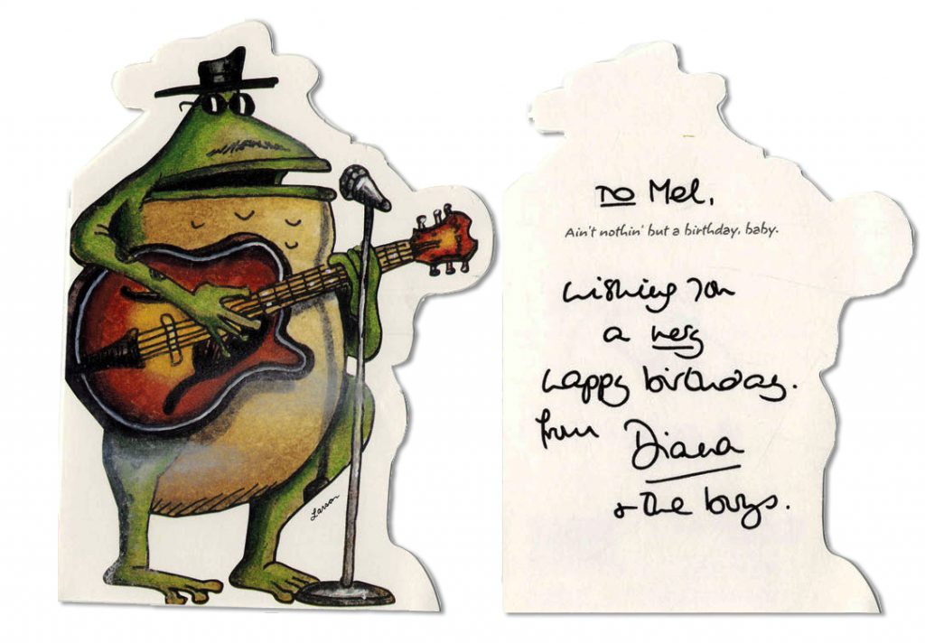 Birthday card bearing an autograph note signed by Diana Spencer as Princess of Wales. Card opens to a printed sentiment and handwritten note that reads, ”To Mel…Wishing you a very happy birthday. / from / Diana / & the boys.” Illustrated card features a drawing of a frog with a guitar by Gary Larson. Measures 5” x 7”. Accompanied by the original envelope hand-inscribed, ”To Mel,” in Lady Di’s hand. Near fine. Sold for $1,250.