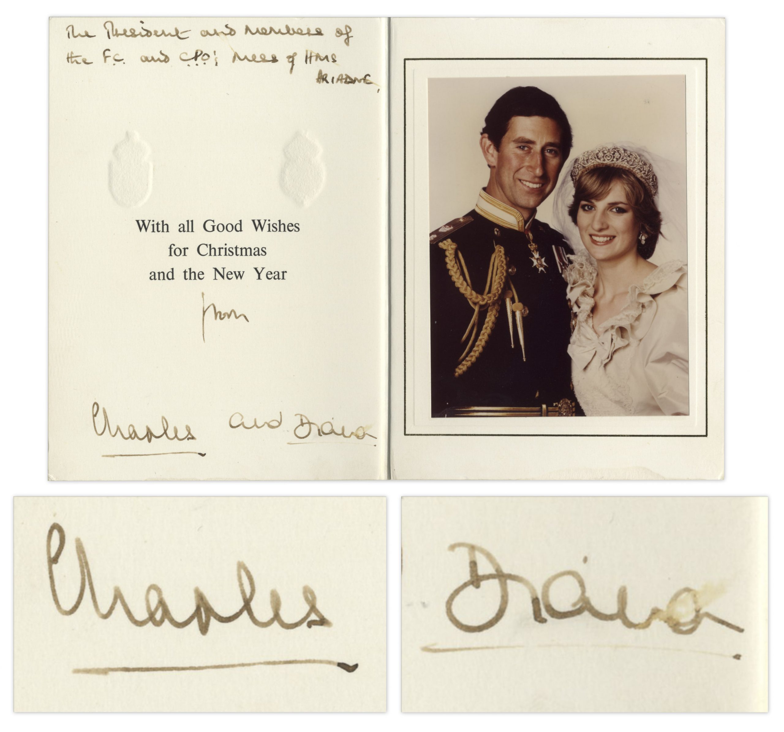 Princess Diana and Prince Charles hand-signed card from 1981 in celebration of Christmas, the New Year and their recent wedding. Cover features the Prince of Wales heraldic badge and the Princess of Wales coat of arms, both gilt-embossed. Charles inscribes the interior, ”Denis and Mrs. S.,” adding ”from Charles” to which Diana signs, ”and Diana.” Card also features a 4” x 5.25” photo of the Royal couple on their wedding day. Entire card, while open, measures 10.5” x 7.25”. Near fine. With original mailing envelope postmarked 17 December 1981 with Royal stamp, addressed to Mr. and Mrs. D. Sturgeon. With University Archives COA. Sold for $1,875.