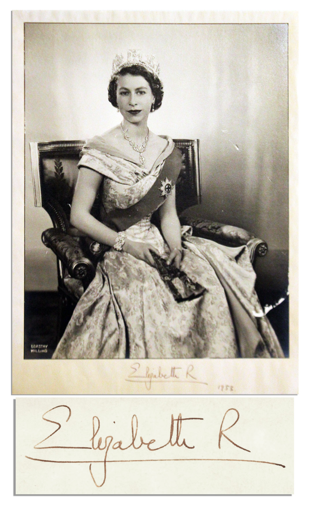 Queen Elizabeth II signs beneath her photo portrait and inscribes the date in her hand: ”Elizabeth R / 1953”, the year of her coronation. Taken by famous photographer Dorothy Wilding, photo is mounted on board, upon which she signs. Image measures 11.5” x 14.25”, matted to 12.5” x 18.25” board. Some toning to board and surface abrasions, not affecting signature or image of the Queen. Overall very good condition. A rare signed photo from the year of her coronation. Sold for $2,384.