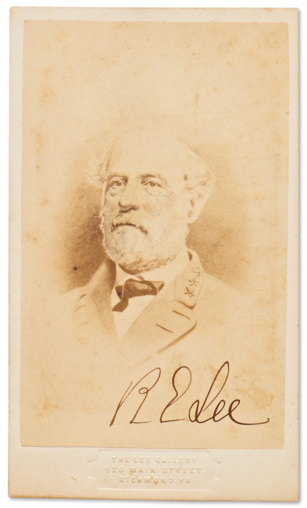 Robert E. Lee CDV photo signed of himself in his Confederate General’s uniform, scarce as such. Clearly signed ”R. E. Lee” at bottom, photo was taken by the Richmond studio of Vannerson & Jones, which sold and changed its name to The Lee Gallery in 1868. By this time, Lee was primarily signing CDVs of himself in civilian clothes, making this CDV, which also has an exceptional signature, unique. With blind-embossed imprint of The Lee Gallery at bottom. Measures 2.5” x 4.25”. Minor soiling and foxing, overall in very good plus condition. Sold for $4,000.