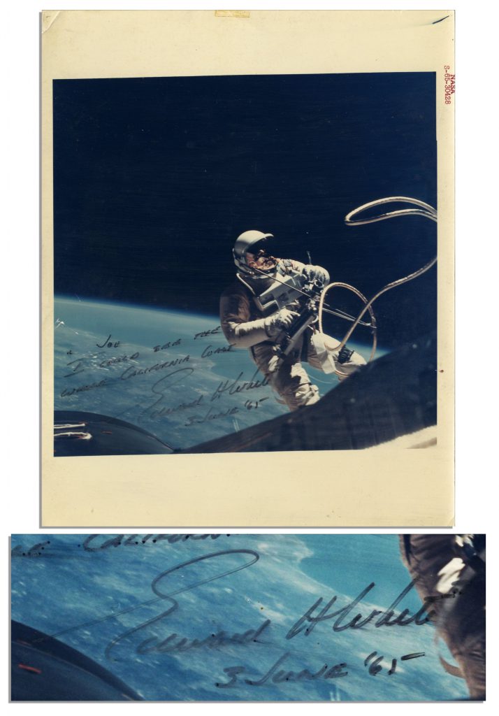 Signed color photo of astronaut Edward White ”walking” in space, the first man to do so on 3 June 1965. Tragically, White was one of three astronauts who died just two years later, in 1967 on an Apollo training mission. NASA photo is inscribed by White with his musings in space, delighting the whole world at the time: ”Joe / ‘I could see the whole California coast’ Edward H White / 3 June ’65”. Semi-matte photo measures 8” x 10” including off-white photographic border. Photo is stamped upon the border to the upper right ”NASA S-65-30428”. Tape remnant at top and light wear to corners. In very good condition. Sold for $1,250.