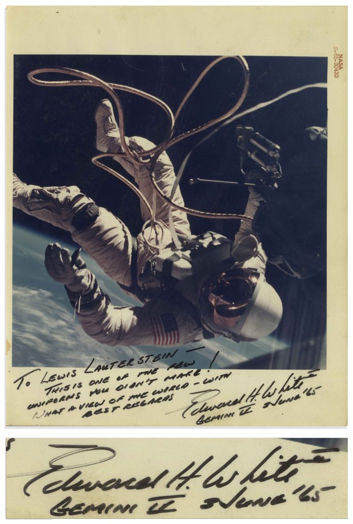 Edward White 8” x 10” signed photo of the Gemini IV mission where White became the first man to perform EVA activity outside the spacecraft, as shown here. White inscribes the photo in black felt-tip, ”To Lewis Lauterstein – This is one of the few uniforms you didn’t make! What a view of the world – with best regards / Edward H. White II / Gemini IV 3 June ’65”. Glossy photo has red NASA number S-65-30433 along margin. Light creasing and wear, overall in very good condition with bold handwriting by White. Sold for $1,250.