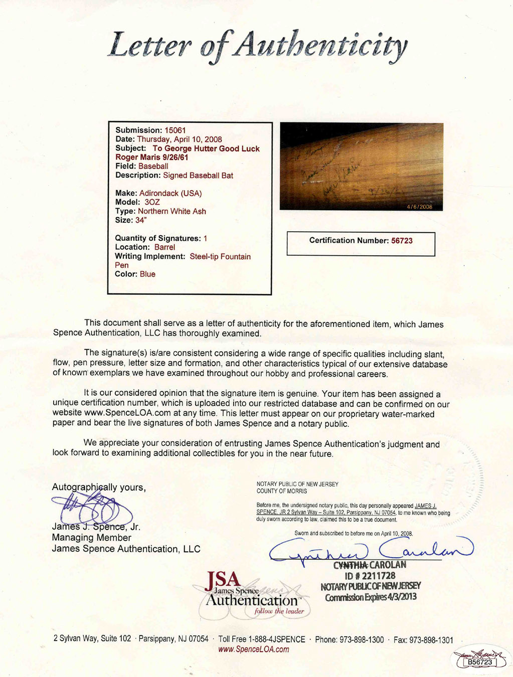 Roger Maris Signed Bat 1961 — With JSA LOA