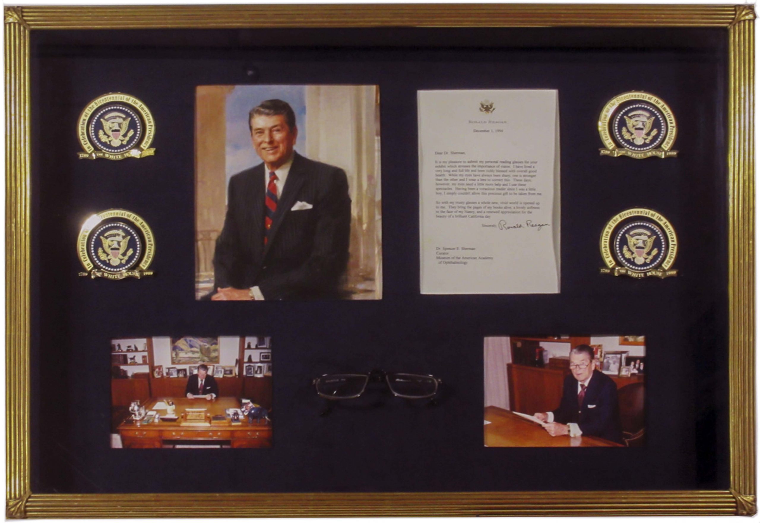 Impressive set of nine eyeglasses owned and worn by nine U.S. Presidents, with many accompanied by signed photos and letters from the Presidents. Set includes eyeglasses worn by nearly every post-WWII President, including: Harry S. Truman, Lyndon B. Johnson, Richard Nixon, Gerald Ford, Jimmy Carter, Ronald Reagan, George H.W. Bush, Bill Clinton and George W. Bush, all gifted to the Museum of Ophthalmology, and each framed in its own presentation shadowbox.