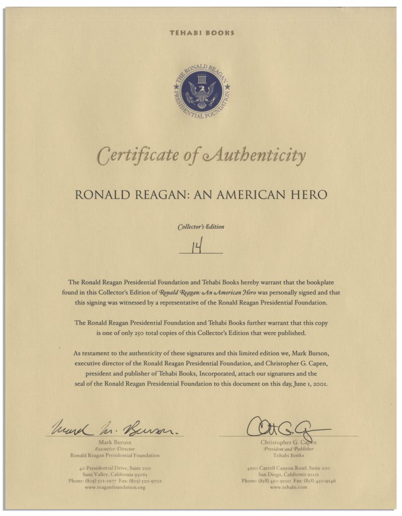 Ronald and Nancy Reagan signed copy of ”Ronald Reagan An American Hero”, extraordinarily rare as one of only 250 in the signed limited edition, this copy being number 14. Published in 2001 by Dorling Kindersley, in concert with Tehabi Books and the Ronald Reagan Presidential Foundation, oversized picture book bound in deep brown leather features four raised bands to spine, gilt lettering and a Great Seal in bronze-colored metal to front cover. 271pp. book documents Reagan’s life as a young man to his political career as Governor, and his Presidency with Nancy beside him as First Lady. Books comes housed in an engraved wood case, lushly lined in navy blue velvet and satin, with the original four commemorative coins completing the set. Signed upon the Presidential Library bookplate, ”Ronald Reagan” and ”Nancy Reagan”, book measures 10.5” x 11.5”. Hinged wooden case measures 14” x 15” x 4”. Small bump to spine and light wear to case consisting of a few scuffs. Overall near fine condition. Accompanied by the COA, jointly-issued by Tehabi Books and the Ronald Reagan Presidential Foundation. Sold for $5,824.