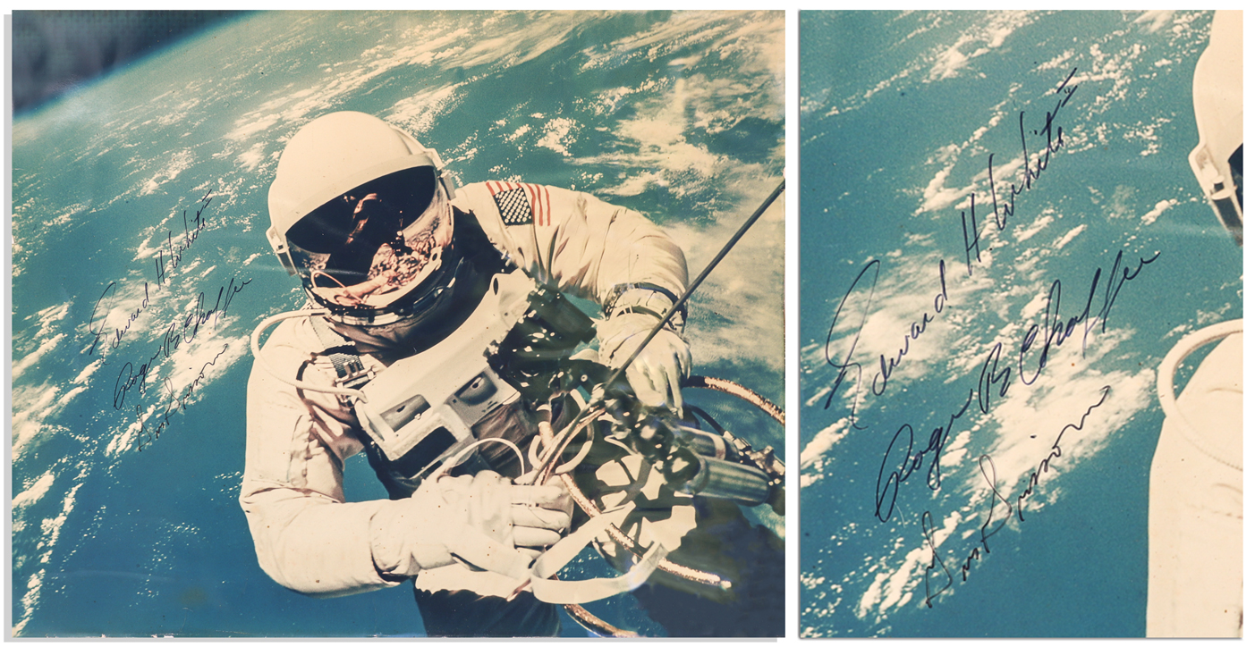 Apollo 1 crew-signed photo measuring 20” x 16”, showing Edward White spacewalking during the Gemini 4 mission. The three astronauts of the fallen Apollo 1 mission provide extraordinarily large autographs in this colorful photo, measuring approximately 6” x 3.5” as a group. Each man signs in black felt-tip, ”Edward H. White II”, ”Roger B. Chaffee” and ”Gus Grissom”. Slight buckling and wear to photo, with small abrasions and chipping to edges, able to be framed out. Overall in very good condition. A rare oversized Apollo 1 crew-signed photo. Sold for $7,500.