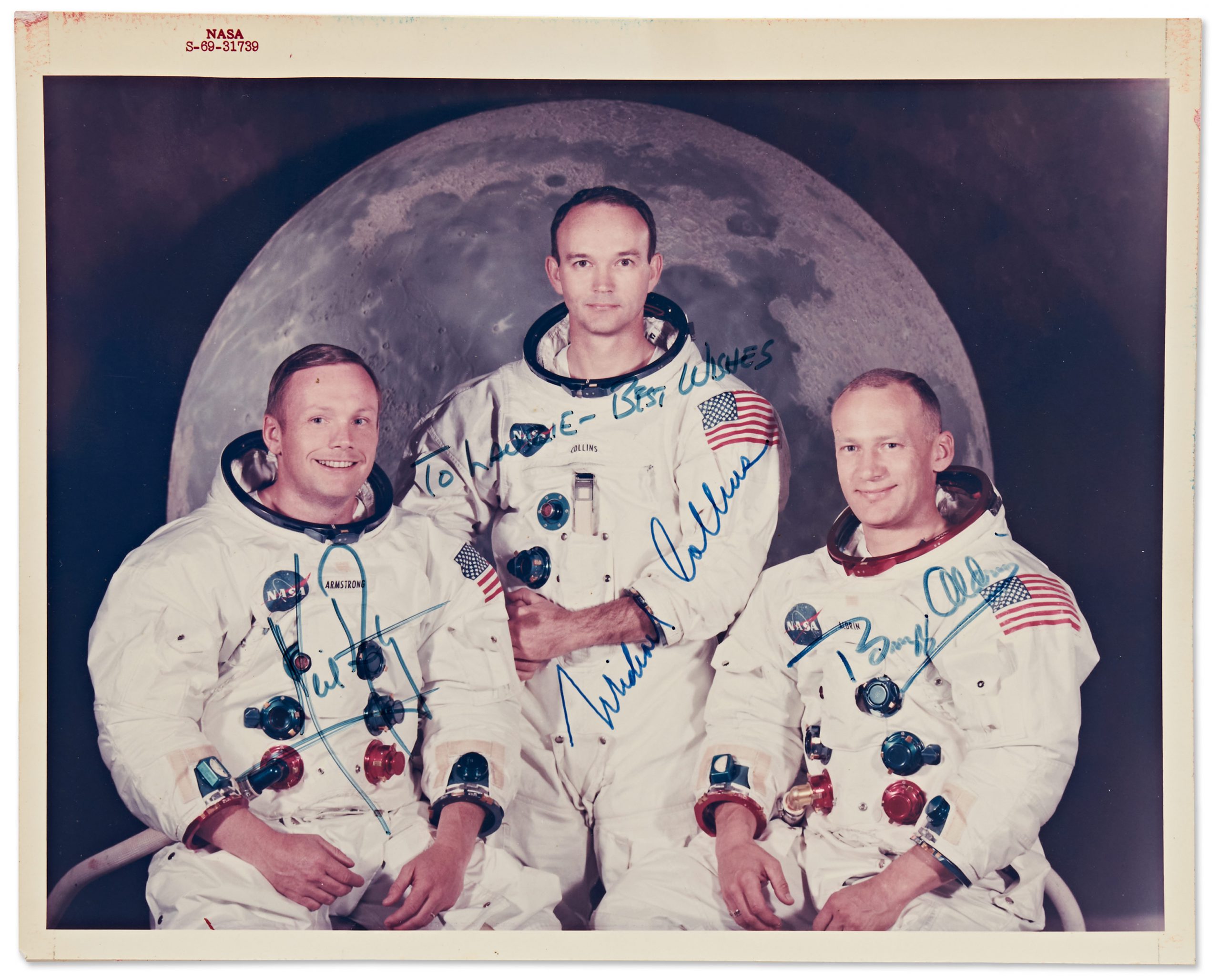 Apollo 11 crew-signed NASA photo. Astronauts Neil Armstrong, Michael Collins and Buzz Aldrin each sign their spacesuits, with no inscription: ”Neil Armstrong”, ”M Collins” and ”Buzz Aldrin”. Semi-matte photo measures 10” x 8”. NASA backstamp on verso is printed above a short summary of Apollo 11. Very minor wear to bottom left corner and minor adhesive residue to verso, otherwise near fine condition. Sold for $6,875.