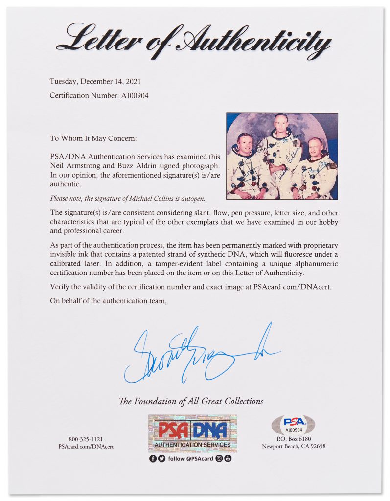 Neil Armstrong and Buzz Aldrin signed Apollo 11 red number photo, with “A Kodak Paper” watermark and NASA press release on verso, with additional autopen signature of Michael Collins. With inscription by Armstrong, “To Laurie – Best Wishes”. Desirable crew portrait shows the three astronauts in their white spacesuits, with photo number S-69-31379 in red at upper left. Glossy photo measures 10″ x 8″. Light creasing, tape to verso along edges, and some discoloration at upper corners. Very good condition. With PSA/DNA COA. Sold for $2,940.