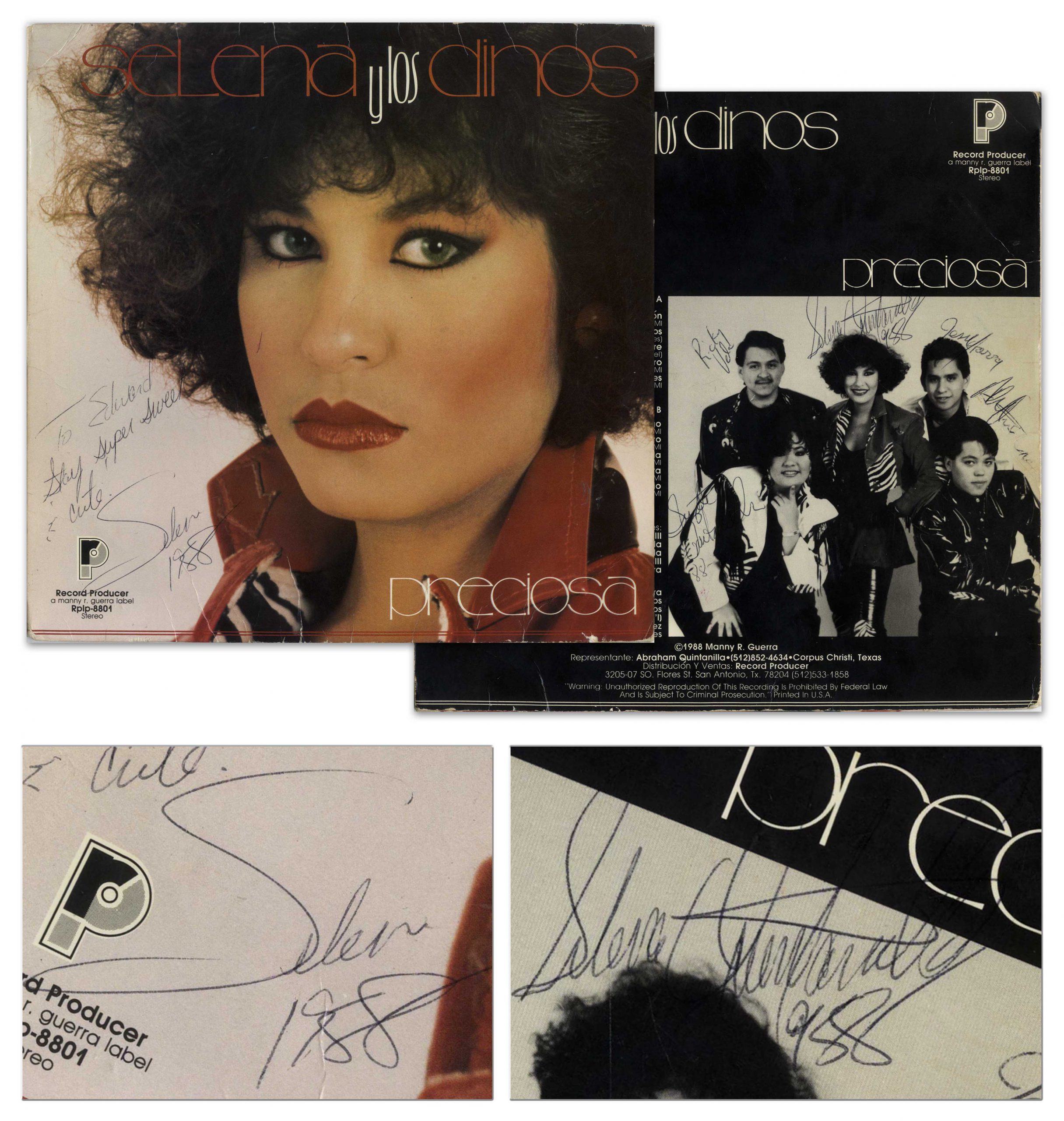 Rare Selena twice-signed ”Preciosa” album, released by her band Selena y Los Dinos in 1988. Selena inscribes the front of the LP, ”To Edward / Stay super sweet & cute / Selena / 1988”, and signs the back with her full name ”Selena Quintanilla / 1988”. The rest of her band also sign the back above their images; all signatures rendered in ballpoint pen. Some creasing and mild abrasions including edgewear, overall in very good condition. Record included, with the name of Ed Perez written on the label. With Roger Epperson COA for all signatures. Sold for $1,125.