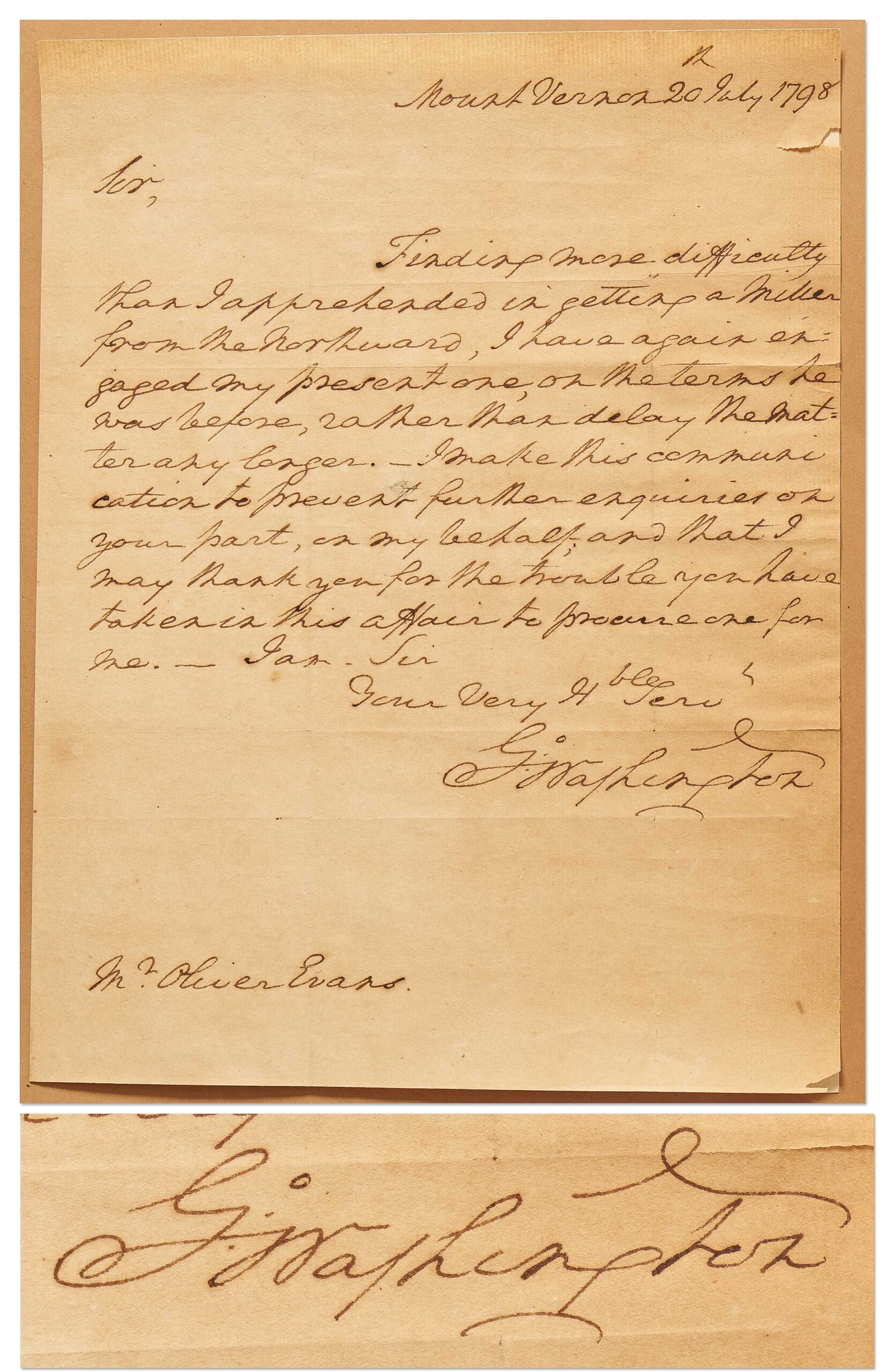 We sold a George Washington autograph letter signed to Oliver Evans, inventor of the first automatic milling system, for $26,620. Letter is dated 20 July 1798, just days after President Adams appointed Washington as Lieutenant General and Commander during the Quasi-War with France. Single page letter measures 6.75 x 8.875 and reads in full:
