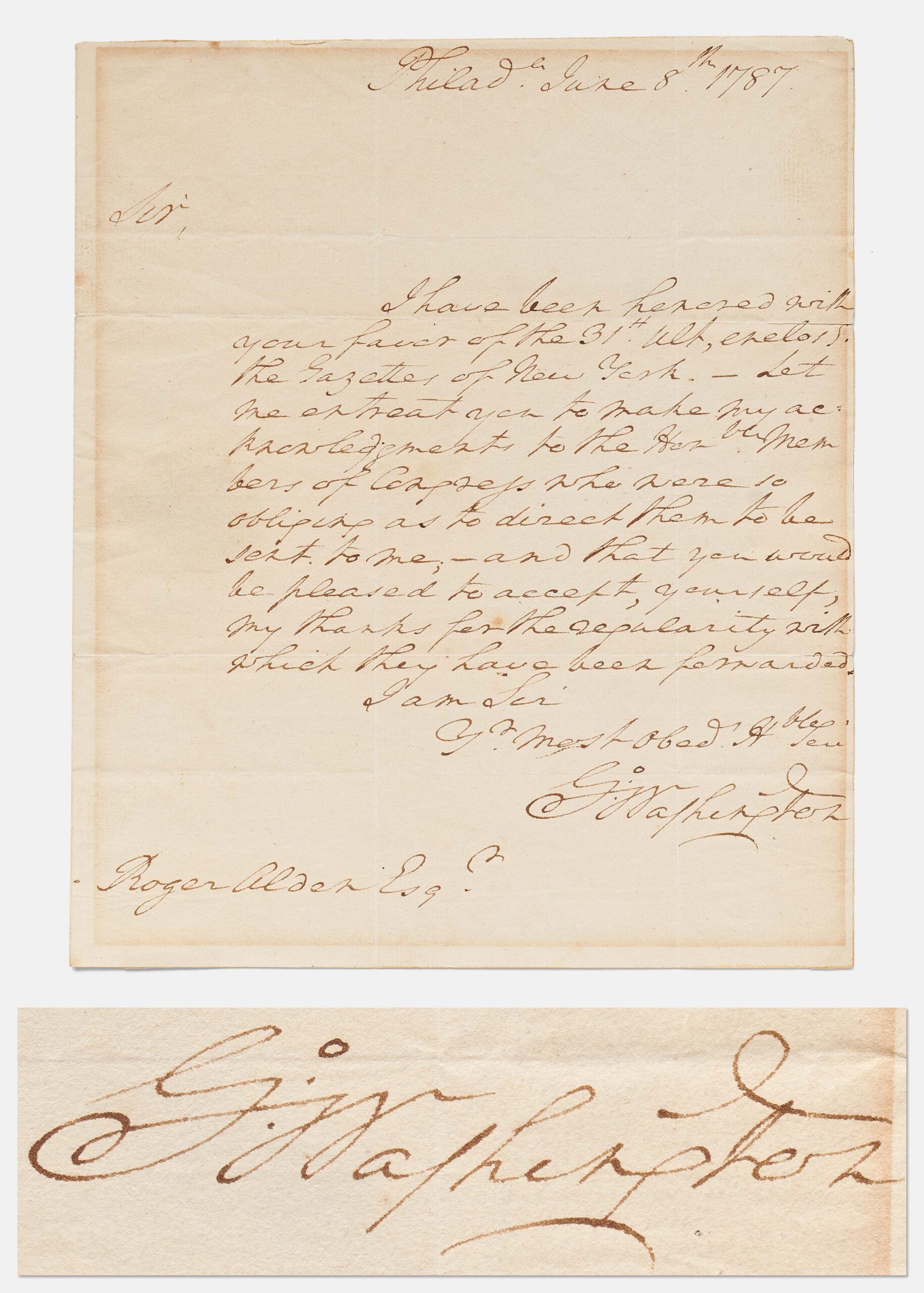 We realized $31,250 for a George Washington autograph letter signed. The letter is dated dated 8 June 1787, just mere weeks after he had been unanimously elected President of the Constitutional Convention. Single page letter to deputy secretary of the Continental Congress, Roger Alden, measures 7.5 x 8.875 inches and reads in full: