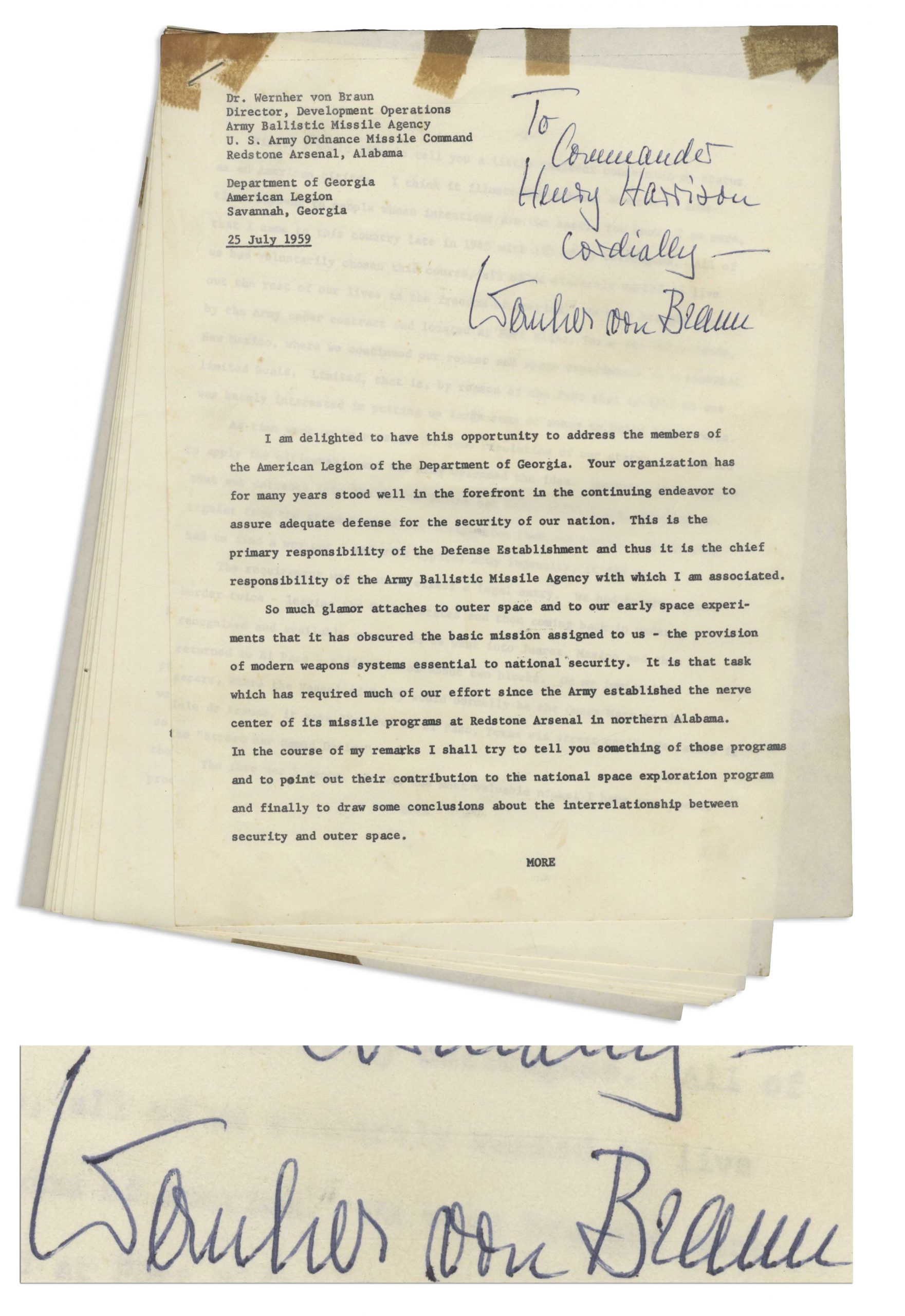 Wernher von Braun served as Director of the Development Operations Division of the U.S. Army Ballistic Missile Agency between 1956 and 1960. During those year he helped develop the Jupiter-C missile which launched the first U.S. satellite and officially made the U.S. a contender in the space race. We sold a Wernher von Braun signed speech that references the Jupiter missile for $4,000. Speech is dated 25 July 1959 and was delivered to the Georgian American Legion.