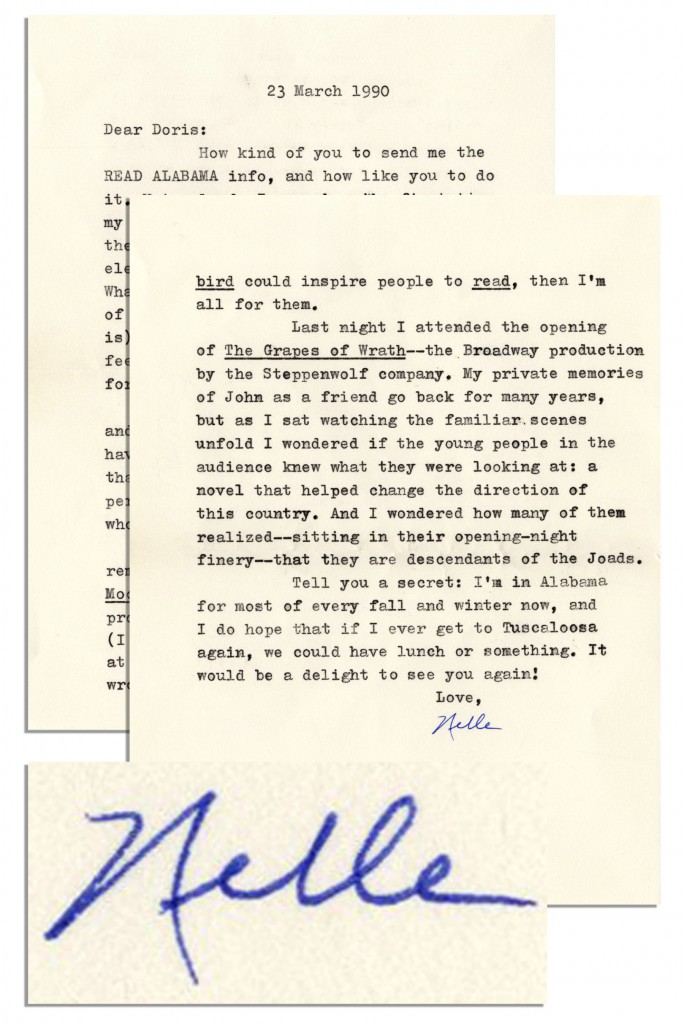 Excellent Harper Lee typed letter signed, dated 23 March 1990, confronting head-on the lingering questions of ”To Kill a Mockingbird’s” authorship. Lee confides in ”Doris: How kind of you to send me the READ ALABAMA info, and how like you to do it. Not only did I remember the first time my opinion was ever sought, I remember that the person seeking it was one of the most elegant-looking creatures I had ever seen. What touched me most was that your generosity of spirit included someone who was (and still is) the reverse of elegant, and made her feel a part of things. You made a friend for life that evening. Yes indeed, I have Alabama Memories, and think it fills a great need. You should have the enormous satisfaction of knowing that your creation will last forever as a permanent asset to all researchers and people who are interested in Alabama writing. Your report of Dr. Beidler’s remarks was most reassuring///I tremble at Mockingbird’s falling into the hands of professors and being Analyzed to death. (I understand there’s one academic nut at large who declares that Truman Capote wrote it!) If panel discussions of Mockingbird could inspire people to read, then I’m all for them. Last night I attended the opening of The Grapes of Wrath///the Broadway production by the Steppenwolf company. My private memories of John as a friend go back for many years, but as I sat watching the familiar scenes unfold I wondered if the young people in the audience knew what they were looking at: a novel that helped change the direction of the country. And I wondered how many of them realized///sitting in their opening-night finery…that they are descendants of the Joads///Love [signed] Nelle”. The two page letter includes original envelope. Each page measures 5.5” x 7.75” in fine condition. Sold for $5,948.