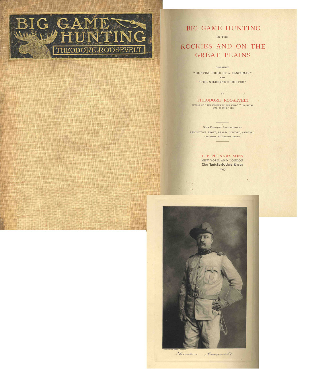 Signed limited edition of Theodore Roosevelt’s ”Big Game Hunting in the Rockies and on the Great Plains”. New York: G.P. Putnam’s Sons: 1899. Number 972 of 1,000. Elegant fountain ink signature to pictorial frontispiece reads ”Theodore Roosevelt” beneath a masculine photograph showing Roosevelt in Rough Rider regalia taken by Civil War photographer George G. Rockwood. This volume combines two previous Roosevelt books ”Hunting Trips of a Ranchman” and ”The Wilderness Hunter”. 476pp. measures 9” x 11.5” and weighs 7 pounds. Wear and some soiling to beige cloth boards, with tape along edges to keep covers intact. Previous owner’s inscription to front free endpaper, else interior is well-preserved, and all 55 illustrations are fully intact with tissue guards. Signed Rough Rider photograph of Roosevelt is display-worthy and near fine. Sold for $2,138.