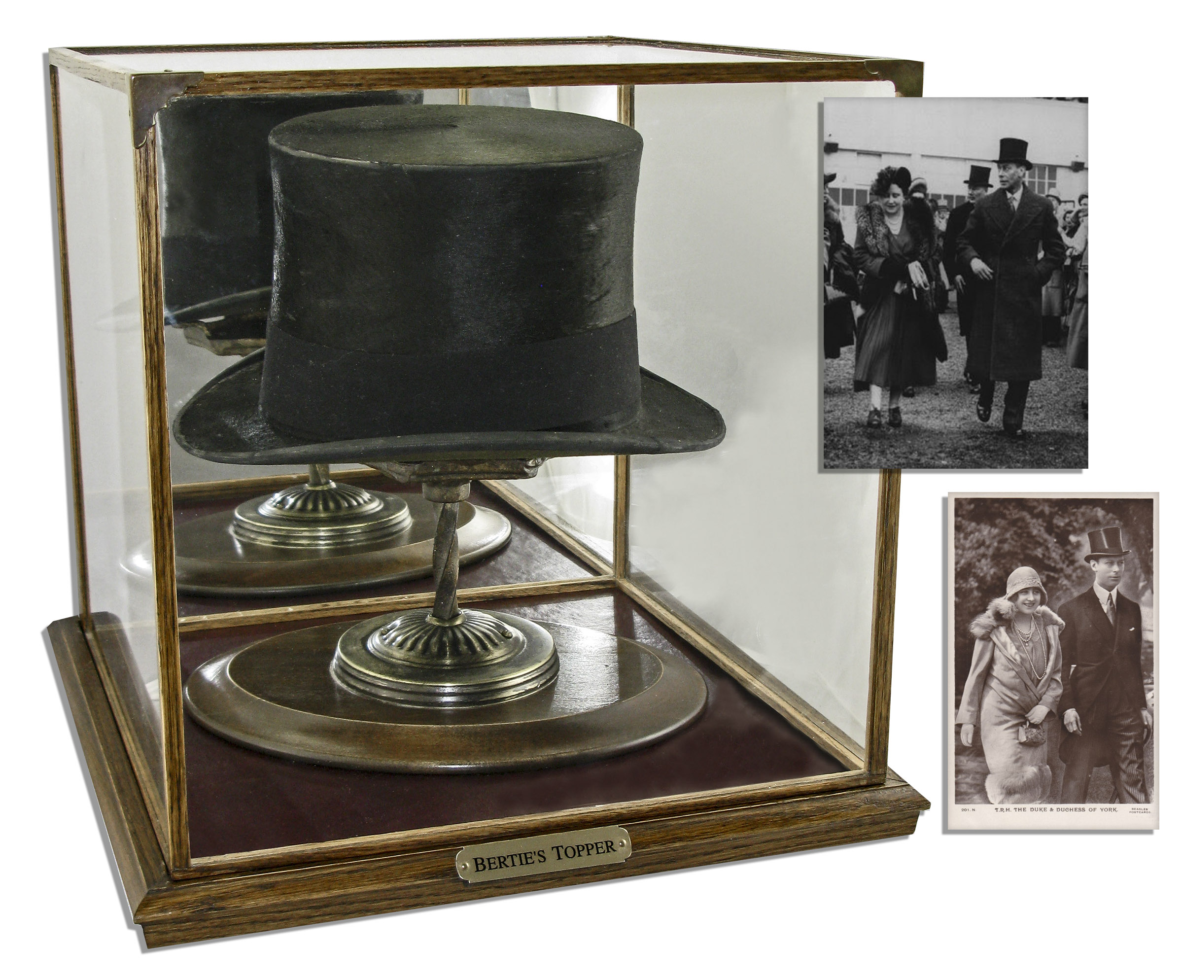 King George VI worn top hat. Plush silk top hat features print to the silk lining that features a Henry Heath Ltd. logo and reads, ”By Special Appointment / to His Majesty the King / Established in the reign of King George IV, 1822 / 105 to 109 Oxford St / London, W.”. Initials ”HRH” appear in gilt beneath. Accompanied by a photo of King George wearing the hat. Displayed in a mirror backed glass and wooden case upon a mahogany and cast iron stand, measuring 16” x 16” x 15”. Hat measures 5.75” in height. Wear to sweatband, else near fine. Sold for $27,500.