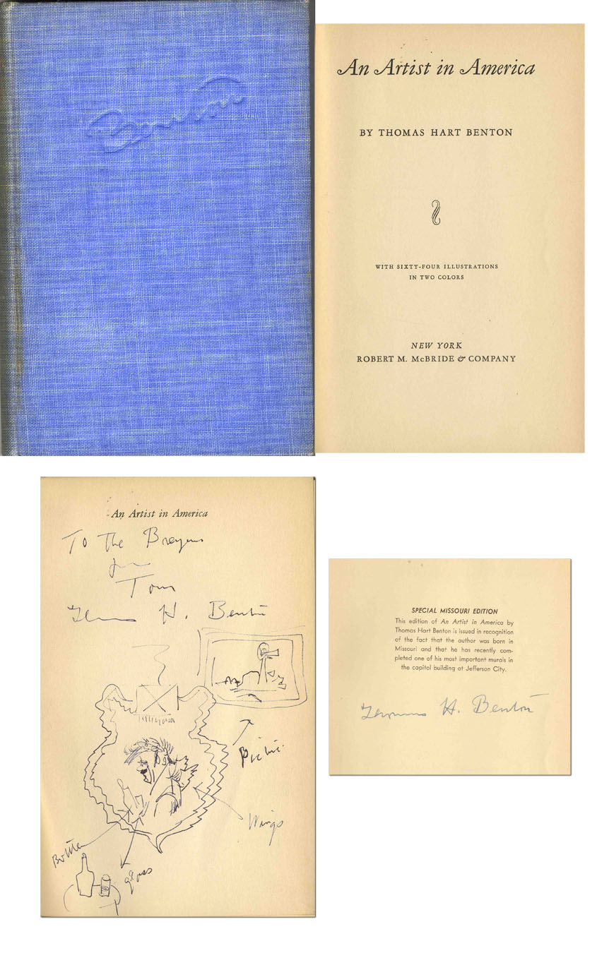 First “Special Missouri Edition” of Thomas Hart Benton’s illustrated autobiography, “An Artist in America,” signed twice: once above an original sketch on the half-title page, and once on the limited edition page. Publisher Robert M. McBride & Company: New York: 1937: 276pp. Measures 6.5″ x 9.5″. Tongue in cheek sketch features a coat of arms encircling a winged drunkard who is holding a wine bottle. Sketch inscribed, “To the [?] for Tom / Thomas H. Benton.” Benton is considered the Father of Abstract Expressionism, a muralist, social critic and teacher of other important artists, including Jackson Pollock. In the chapter entitled “Art and Cities” Benton comments on his awkward introduction into New York’s underworld society, “…as long as I had my face over a highball I didn’t mind and returned as much as was given to me.” Like Henry Miller, his talk is straight, at times shocking and decidedly personal. Item includes insert describing Benton’s involvement with the Associated American Artists and an invitation to receive their catalog and visit their galleries. Blue cloth hardcover, lacking dustjacket. Both front and back hinges are cracked, light foxing throughout, overall in good condition. Sold for $934.