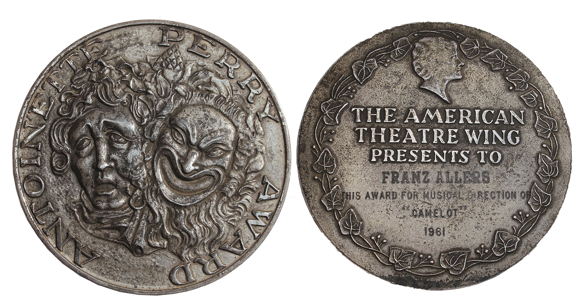 Franz Allers 1961 Tony Award from ”Camelot” for Best Musical Direction. Award medal shows the contrasting tragedy/comedy faces of the stage, around which reads ”Antoinette Perry Award”. Medal reverse is custom engraved for Allers within an ivy wreath design, ”The American / Theatre Wing / Presents To / FRANZ ALLERS / This Award For Musical Direction Of / ‘Camelot’ / 1961”. Richard Burton and Julie Andrews starred in ”Camelot”, which achieved considerable success after Ed Sullivan promoted it on his eponymous show. JFK was such a fan that he often listened to a recording of the play at the White House. It was nominated for 5 Tonys in 1961 and won 4 including Best Actor for Richard Burton. Silver medal measures 3” in diameter. Sterling silver mark of ”STER.” appears on the rim. Some tarnishing and light scratching, overall in very good condition. With an LOA from Franz Aller’s grandson. Sold for $12,500.