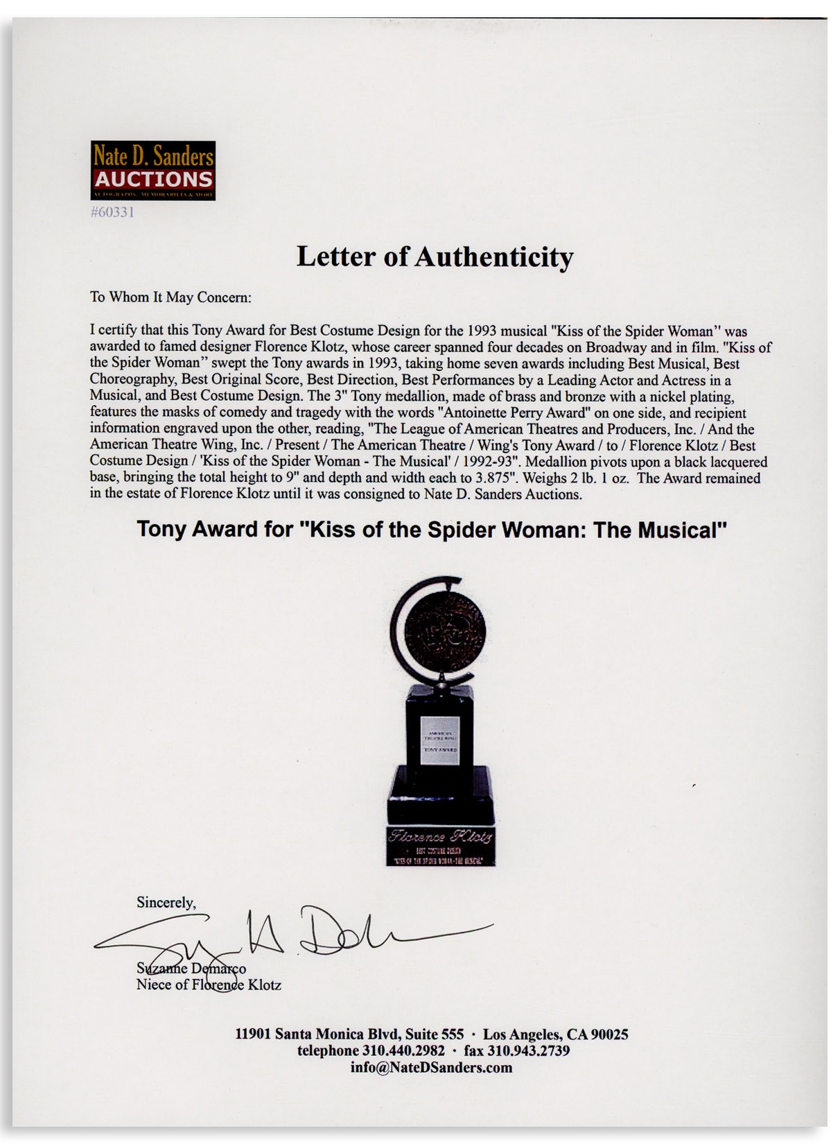 Tony Award for the 1993 musical ”Kiss of the Spider Woman”, which swept the Tony awards in 1993, taking home seven awards including Best Musical, Best Choreography, Best Original Score, Best Direction, Best Performances by a Leading Actor and Actress in a Musical, and Best Costume Design. This Tony Award is for the Best Costume Design, awarded to famed designer Florence Klotz, whose career spanned four decades on Broadway and in film; Klotz even designed Elizabeth’s Taylor’s wedding dress to John Warner. The 3” Tony medallion, made of brass and bronze with a nickel plating, features the masks of comedy and tragedy with the words ”Antoinette Perry Award” on one side, and recipient information engraved upon the other, reading, ”The League of American Theatres and Producers, Inc. / And the American Theatre Wing, Inc. / Present / The American Theatre / Wing’s Tony Award / to / Florence Klotz / Best Costume Design / ‘Kiss of the Spider Woman – The Musical’ / 1992-93”. Medallion pivots upon a black lacquered base, bringing the total height to 9” and depth and width each to 3.875”. Weighs 2 lb. 1 oz. Some tarnishing to medallion, overall in near fine condition. From the estate of Florence Klotz. Sold for $7,500.