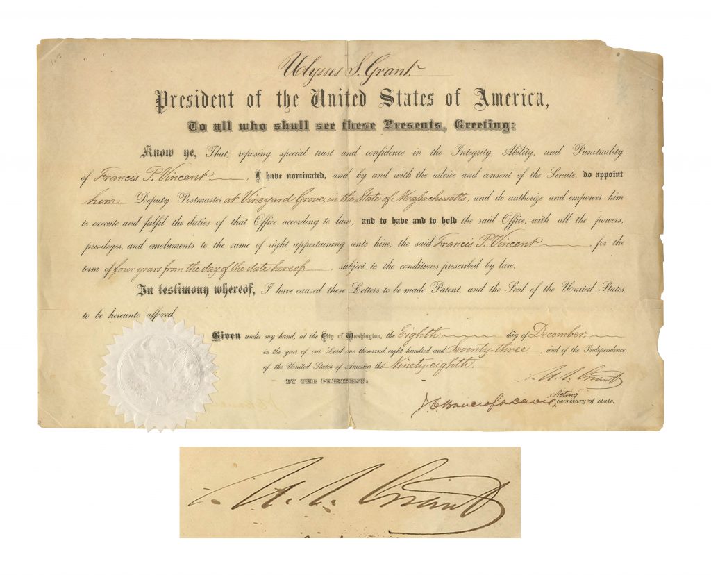 Attractive document signed by Ulysses S. Grant as President, appointing Francis Vincent as Deputy Postmaster of Vineyard Grove, Massachusetts. Signed “U.S. Grant” on 8 December 1873. With intact white Great Seal at lower left. Measures 16.5″ x 10.5″. Archival repair to paper’s verso and chipping along edges. Overall in very good condition. Sold for $938.