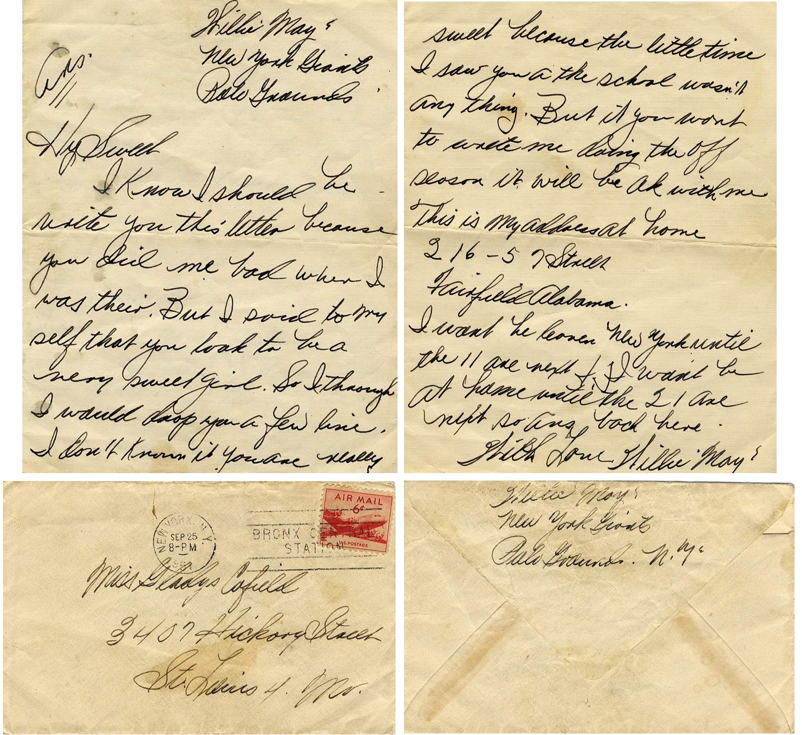 Willie Mays signed autograph letter accompanied by holographic cover dated 25 September 1951. Letter composed a mere few months after Mays made his 25 May 1951 debut in the New York Giants vs. Philadelphia Phillies at Shibe Park. Letter reads in full, “Willie May / New York Giants / Palo Grounds / Hy Sweet, I know I should be write you this letter because you did me bad when I was their. But I said to my self that you look to be a very sweet girl. So I thought I would drop you a few line. I don’t know it you are really sweet because the little time I saw you at the school wasn’t any thing. But it you won’t to write me doing the off season it will be OK with me. This is my address at home. 216-57 Stuell Fairfield Alabama. I won’t be leaving New York until the 11 are next. I won’t be at home until the 21 are next so are back here. With Love Willie Mays (signed).” Accompanying cover addressed to: “Miss Gladys Cafield / 3407 Hickory Street / St. Louis, MO” with Mays’ return address, “Willie Mays / New York Giants / Palo Grounds, N.Y.” Black ink letter, measuring 5″ x 6.5″, runs 2pp. Stray stains and mild overall toning, otherwise in fine condition. A scarce and unique Willie Mays signed letter with nice autograph. Sold for $2,695.