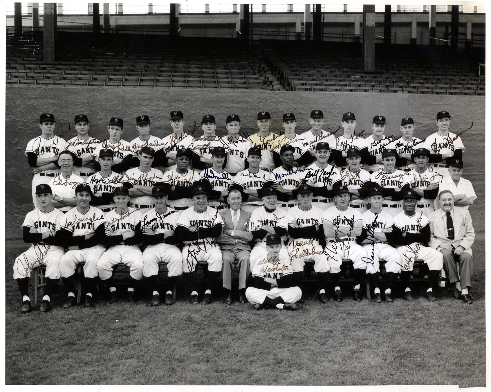 World Series winners 1954 New York Giants team signed photo. Signed in black by 36 team members atop their respective images, from the top row, left to right: ”Paul Giel”, ”Joe Amalfitano”, ”Don Liddle”, ”Bill Gardner”, ”Al Worthington”, ”Foster Castleman”, ”J. McCall”, ”Al Corwin”, ”Marv Grissom”, ”Ray Katt”, ”George Spencer”, ”Wes Westrum”, ”Jim Hearn”. Second row is signed: ”Ed Logan”, ”Hoyt Wilhelm”, ”Jim Rhodes”, ”Willie Mays”, ”Don Mueller”, ”Al Dark”, ”Monte Irwin”, ”Bill Taylor”, ”Bob Hofman”, ”Joe Garagiola”, ”Ruben Gomez”. Bottom row is signed: ”Johnny Antonelli”, ”Sal Maglie”, ”Whitey Lockman”, ”Larry Jansen”, ”Leo Durocher”, ”Frank Shellenback”, (Giants scout), ”Herman Franks”, ”Dave Williams” and ”Hank Thompson”. Two signatures are illegible. Glossy photo measures 14” x 11.25”. Scattered creasing and mild soiling to verso, else near fine. Larry Jansen’s name is hand written to verso, possibly in his hand. From Jansen’s personal estate with an LOA from his son. Sold for $2,578.