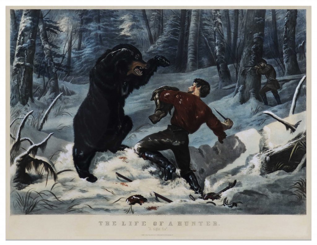 Beautiful Currier & Ives hand-colored lithograph entitled “The Life of a Hunter. ‘A tight fix’”. Produced in 1861 on wove paper, lithograph measures 28″ x 21.5″, framed to 39″ x 32.25″. Very well-preserved with deep, rich colors. A few small repaired tears to margin, with two extending slightly into the image at top and bottom right, though nearly indiscernible; also with faint discoloration to margins, else near fine condition. A rare lithograph so well preserved by the storied print makers. Sold for $31,680.
