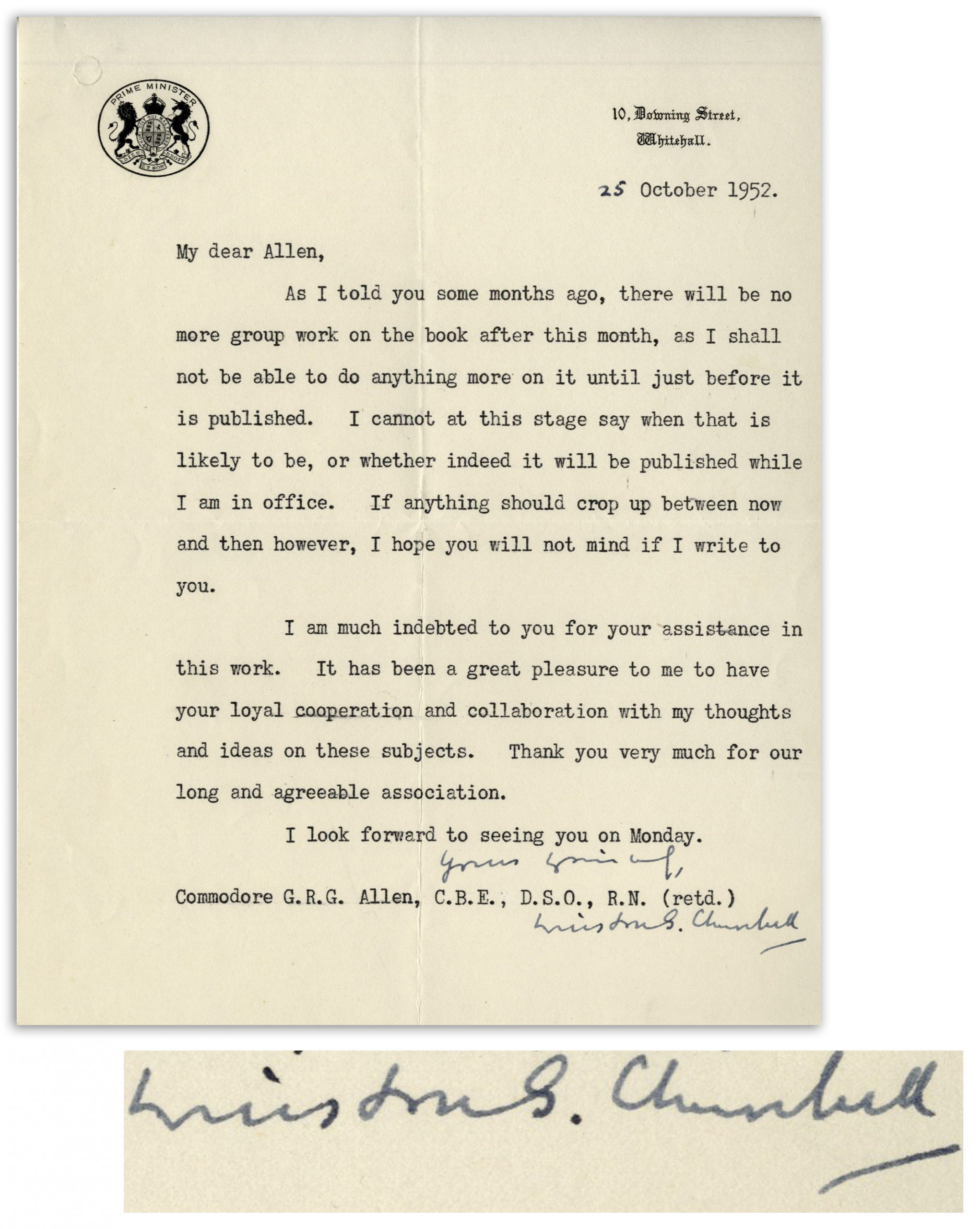 Winston Churchill typed letter signed as Prime Minister, regarding publication of his highly acclaimed memoir, “The Second World War”. Churchill writes on his Prime Minister letterhead, embossed with “10, Downing Street”, on 25 October 1952 to Commodore Gordon Allen, part of his “Syndicate” who helped him write the book series. Letter reads in part, “As I told you some months ago, there will be no more group work on the book after this month, as I shall not be able to do anything more on it until just before it is published. I cannot at this stage say when that is likely to be, or whether indeed it will be published while I am in office. If anything should crop up between now and then however, I hope you will not mind if I write to you. / I am much indebted to you for your assistance in this work. It has been a great pleasure to me to have your loyal cooperation and collaboration with my thoughts and ideas on these subjects. Thank you very much for our long and agreeable association. / I look forward to seeing you on Monday. [signed] Yours sincerely, Winston S. Churchill”. Letter measures 7.5″ x 9.5″. Folds, and hole puncture at top left, otherwise near fine condition. Sold for $2,005.