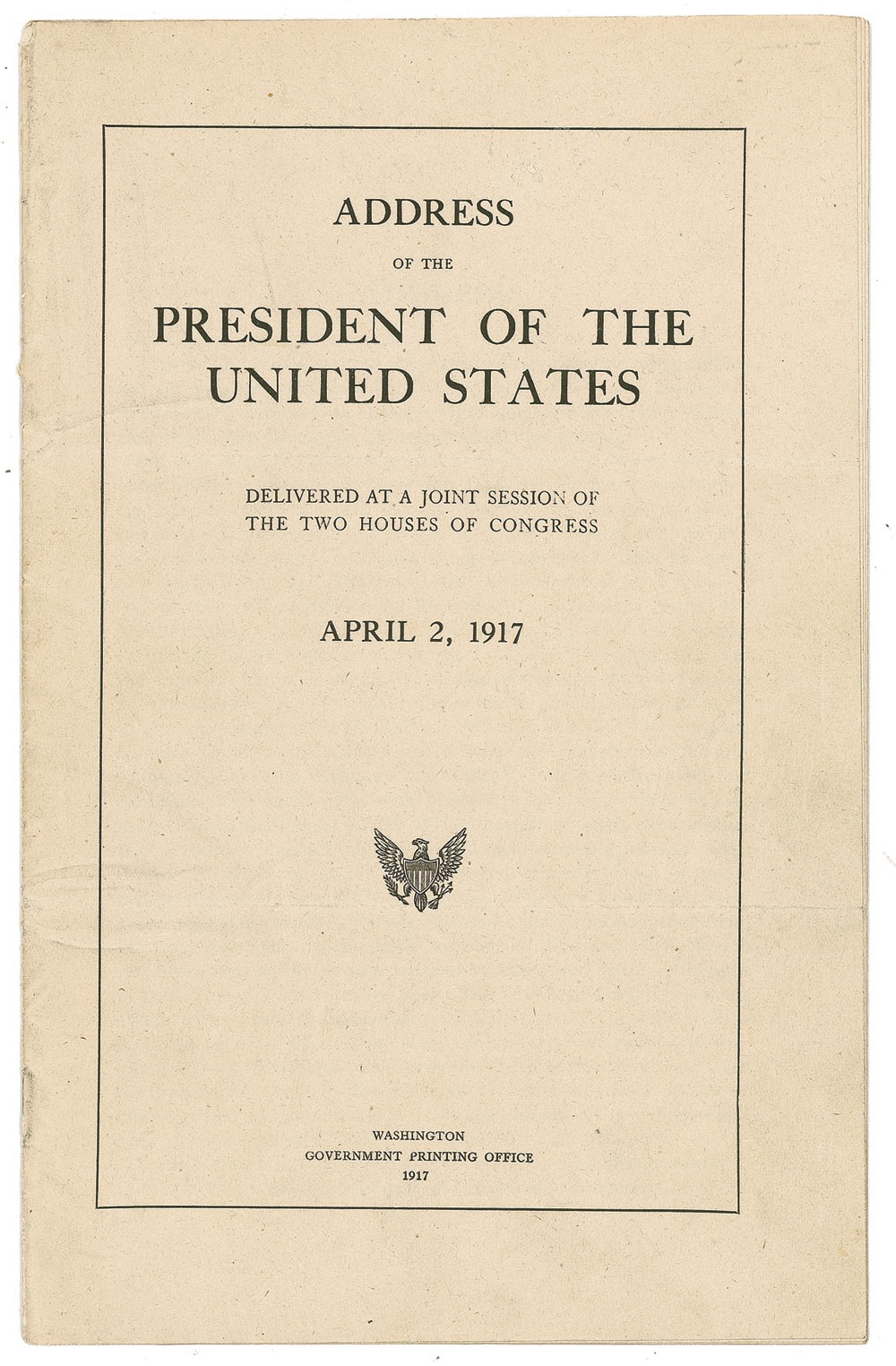 Incredible signed speech by President Woodrow Wilson, triggering the start of World War I. Historic speech printed in booklet form, “Address of the President of the United States, Delivered at a Joint Session of the Two Houses of Congress, April 2, 1917″ in which Wilson asks the U.S. Congress for a declaration of war on Germany. Signed at the conclusion in black ink by Wilson. Booklet measures 6″ x 9”, runs ten pages, issued by the Government Printing Office. Two horizontal folds, partial separation to front cover, mounting remnants to back cover and mild handling wear; overall very good condition. An important piece of Presidential, American and world military history. Sold for $3,000.