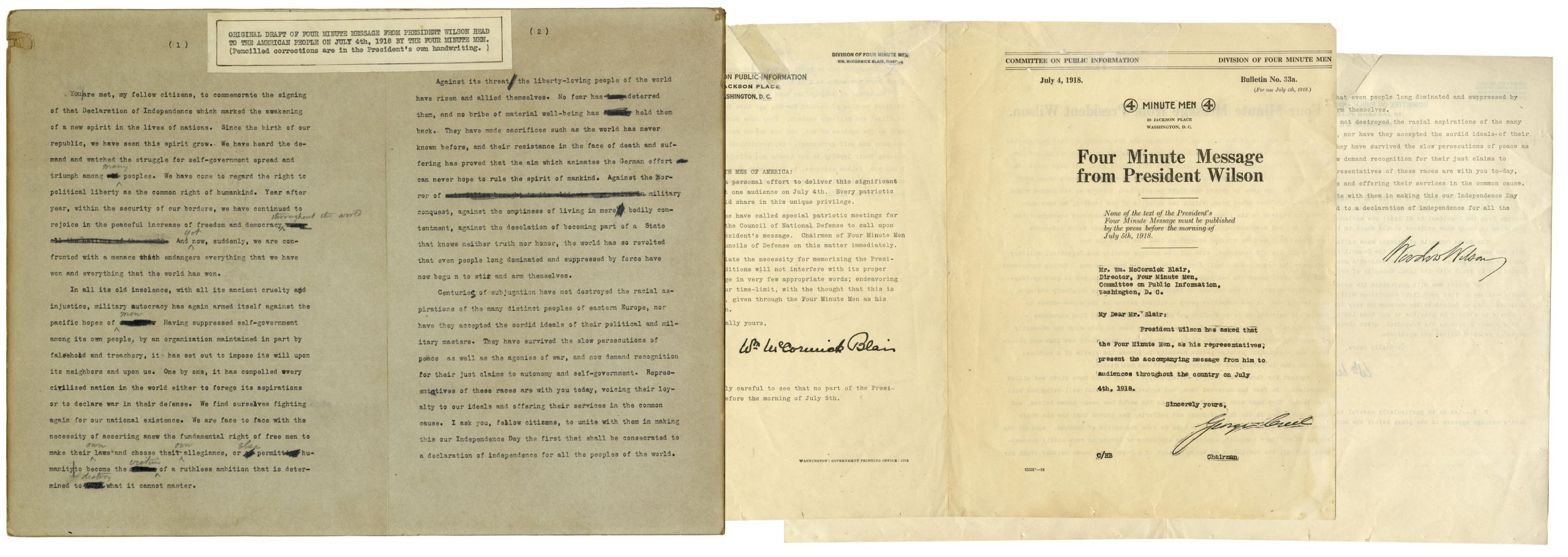 Fiery speech draft at the height of WWI, hand-annotated by President Woodrow Wilson who would deliver the speech on July 4, 1918. This ”Four Minute” speech was made by Wilson on Independence Day as part of a series of speeches four minutes in length that ran between reels at movie theatres. Wilson makes several corrections to the speech in pencil, inserting words and crossing others out. It reads in part, ”…with all its ancient cruelty and injustice, military autocracy has again armed itself against the pacific hopes of men. Having suppressed self-government among its own people, by an organization maintained in part by falsehood and treachery, it has set out to impose its will upon its neighbors and us…We find ourselves fighting again for our national existence…” Two page speech is mounted to board measuring 14.75” x 11”. Chip to upper left of board, overall very good condition. Accompanied by the final version of the speech, typed and with a printed signature by Wilson. Sold for $1,875.